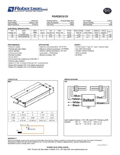 ROBERTSON 3P20131 RSW226CQ120 /A Fluorescent Electronic Ballast for 2 CFQ26W/G24q CFL Lamps, Preheat Rapid Start, 120Vac, 50-60Hz, Normal Ballast Factor, NPF (Successor to ROBERTSON 3P20035 RSO226CQ120 /A - Please confirm all specifications to our datashe