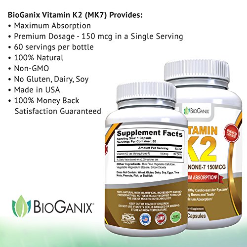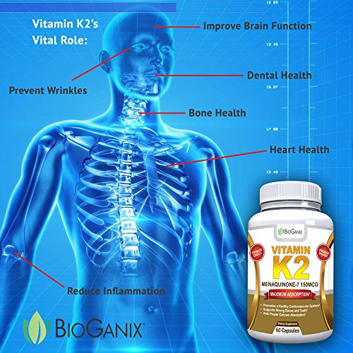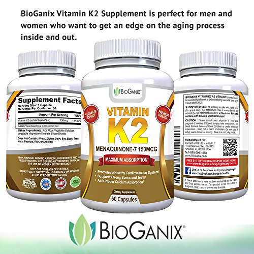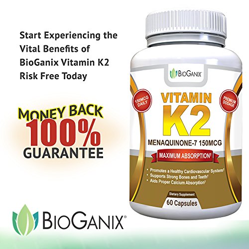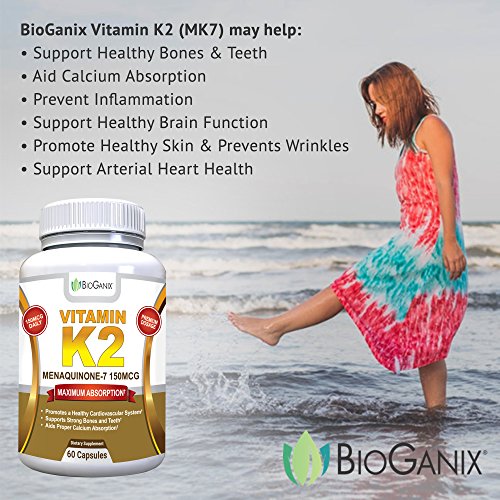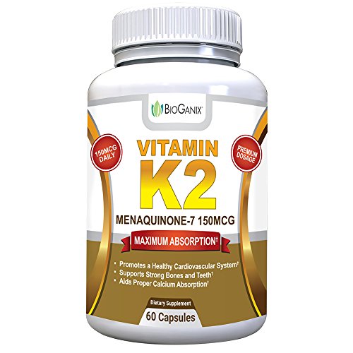 -. Binding : Health and Beauty -. Brand : BioGanix -. EAN : 0860782000434 -. Feature : BIOLOGICALLY ACTIVE FORM - Vitamin K2 as Menaquinone-7 (MK-7) is a more biologically active form than MK-4, studies show it lasts longer in the bloodstream for increased absorption by the body; High potency dosage of 150 mcg in a single serving for more heart and bone health benefits in every dose / HEART HEALTH - Pure Vitamin K2 is a wise choice as a cardiovascular supplement to promote cardiovascular health by preventing calcium from being deposited in blood vessels and arterial walls; Inhibits vascular and soft tissue calcification / BONE HEALTH - K2 Vitamins Aid Proper Calcium Utilization - Supports bone strength and healthy teeth by directing calcium into bones and teeth and away from arteries; Inhibits calcium deposits into soft tissue which helps to preserve blood vessel elasticity / VITAMIN K2's VITAL ROLE - The natural aging process, along with improper diet and lifestyle, can rob the body of Vitamin K2, creating a deficiency which can lead to weakening bones and calcification (hardening) of the arteries; Lack of Vitamin K2 or reduced bioavailability of it, can also be a contributing factor and one that can be easily resolved with daily natural Vitamin K2 (MenaQ7) supplementation; As people age K2 plays a more vital role in keeping the body functioning at its best / SATISFACTION GUARANTEED - Try BioGanix Vitamin K2 (MK7) completely RISK FREE with a full manufacturer's money back guarantee; If you aren't completely satisfied with your results simply ask for your money back and we'll offer you a full refund -. IsAdultProduct : 0 -. Label : BioGanix -. LegalDisclaimer : All statements on the label and amazon listing have not been evaluated by the Food and Drug Administration. This product is not intended to diagnose, treat, cure or prevent any disease. ** BioGanix is a registered brand on amazon the only company to sell BioGanix products on Amazon. Actual product packaging and materials may contain more and different information than what is shown on our website. We recommend that you do not rely solely on the information presented and that you always read labels, warnings, and directions before using or consuming a product. -. Manufacturer : BioGanix -. MPN : bioganix-vitamink2-60a -. PackageQuantity : 1 -. PartNumber : bioganix-vitamink2-60a -. ProductGroup : Health and Beauty -. ProductTypeName : HEALTH_PERSONAL_CARE -. Publisher : BioGanix -. Studio : BioGanix -. Title : BioGanix Vitamin K2 MK7 (MenaQ7) for Maximum Bioavailability - Supports a Healthy Heart, Strong Bones and Teeth, Aids Proper Calcium Utilization - 150mcg Single Serving Supplement, 60 Capsules -. UPC : 860782000434