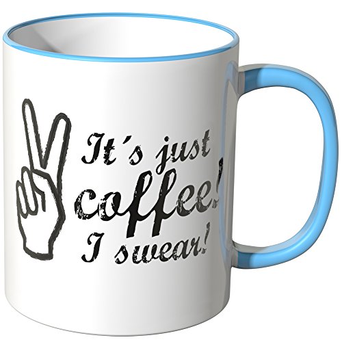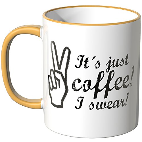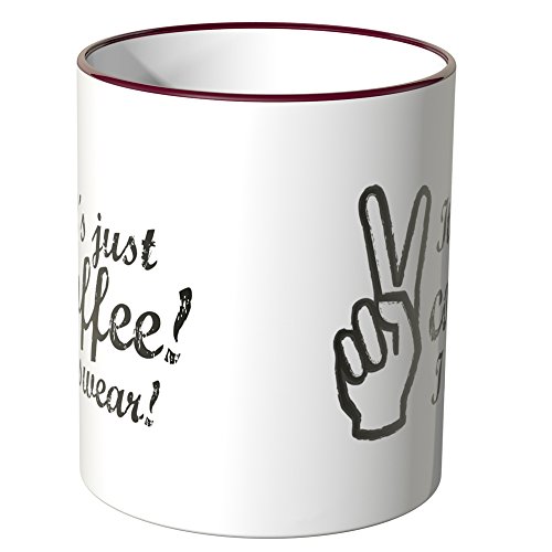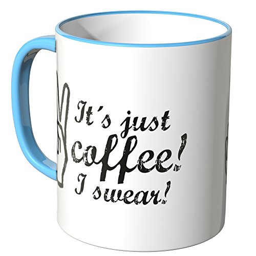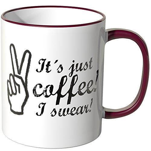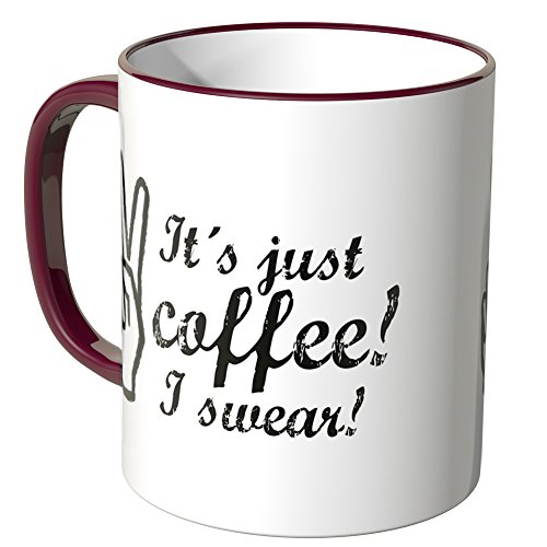 -. Feature : Exklusive Wandkings Keramiktasse mit Spruch "It´s just coffee, I swear". Made in Germany! / Tasse mit farbigem Henkel in Ihrer Wunschfarbe. Sie können aus 12 Farben frei wählen. / Hochwertige Verarbeitung. Langlebige Qualität. Spülmaschinen- und mikrowellenfest. / Maße der Tasse: Größe ø 82 mm, Höhe 95 mm, Fassungsvermögen 0,3 l - beidseitig bedruckt. / Lieferumfang: 1x Wandkings Tasse mit Spruch "It´s just coffee, I swear" in Ihrer Wunschfarbe.