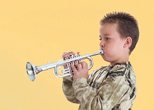 Music is one of the great joys of childhood, and kids that learn music are proven to do better in skills like science and math. This Click n' Play Trumpet makes learning music fun and exciting. You'll find that with this durable 4 keys Trumpet, burgeoning musicians can't get enough as they experiment by blowing and pressing on keys which produces realistic sounds! The size of this unique Trumpet is 16.5 inches and it's heavy-duty constructed from European material which have passed all tests for lead and other unsafe chemicals. It is a great gift for kids of any age from three and up.Feature