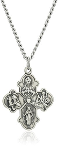 -. Binding : Jewelry -. Brand : Amazon Collection -. Color : Silver -. Department : women -. EAN : 0696736877667 -. Feature : Sterling silver cross necklace with four-way design showcasing depictions of the Sacred Heart medal, Saint Joseph medal, Saint Christopher medal, and Miraculous medal / Embossed with "I am a Catholic Please call a P.R.Iest" at back / Curb chain with sP.R.Ing-ring clasp / Made in the USA -. Label : Amazon Curated Collection -. Manufacturer : Amazon Curated Collection -. Model : AMZ107SC -. MPN : AMZ107SC -. PartNumber : AMZ107SC -. ProductGroup : Jewelry -. ProductTypeName : FINENECKLACEBRACELETANKLET -. Publisher : Amazon Curated Collection -. Studio : Amazon Curated Collection -. Title : Sterling Silver Four Way Medal with Antique Finish and Stainless Steel Chain, 24" -. UPC : 696736877667
