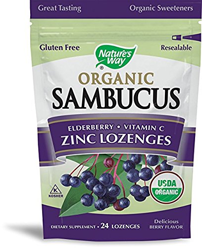 Nature's Way Organic Zinc Lozenges with Elderberry and Vitamin C is made with certified organic brown rice syrup and organic dried cane syrup It is gluten free and certified Kosher with no artificial preservatives, flavors or colors. It is made with our unique, full-spectrum black elderberry extract. The standardized extract produced that great tasting and natural yet delicious raspberry flavor. From premium cultivar, organically grown black elderberries naturally richer in flavonoids BioActives. Gentle, solvent-free extraction ensures maximum flavonoid potency. Each lozenge provides 12.5mg of black elderberry extract plus zinc (5mg) and 100 percent of the daily value of vitamin c (60mg).Feature