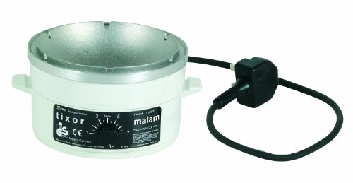 Der stufenlose Temperaturregler ermöglicht das Flüssighalten des Wachses in verschiedenen Temperaturen. Die gebräuchlichste Arbeitstemperatur erreicht man bei einer Einstellung des Temperaturreglers im Skalenbereich 6. Das tropfenlose Batiken mit Tjanting bzw. Batikkännchen gelingt am besten, wenn die Wachsmenge die Minimummarke der Schmelzpfanne nicht übersteigt. Um mit dem Pinsel zu arbeiten, kann nach Belieben Wachs nachgefüllt werden. Das Abstreifen erfolgt am Innenrand. Vor jedem Arbeitsbeginn sollten Wachsrückstände mit einem Lappen entfernt werden. Technische Daten: 230 V, 50 Hz, 300 Watt, Max. Temperatur ca. 135° C, Temperaturschmelzsicherung gegen Überhitzung, Ø 160 mm, mit Griffen 200 mm, Höhe 100 mm, Gewicht ca. 600 g, Schmelzpfanne Aludruckguss, 0,3 Liter Inhalt, Gehäuse aus Kunststoff, GS-Zeichen. Sicherheitshinweise: Gerät und Schmelzgut werden während des Betriebes sehr heiß, deshalb zur Vermeidung von Verbrennungsgefahr möglichst nicht in heißem Zustand tragen. Nach dem