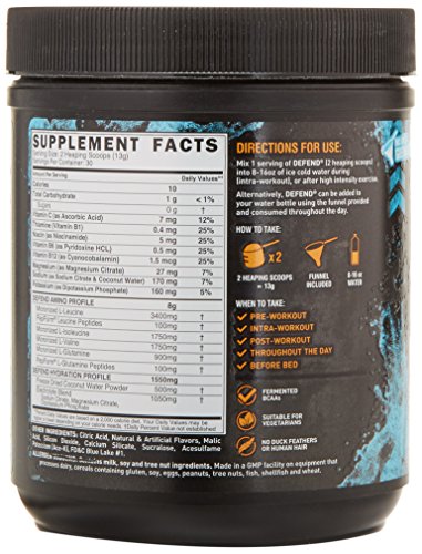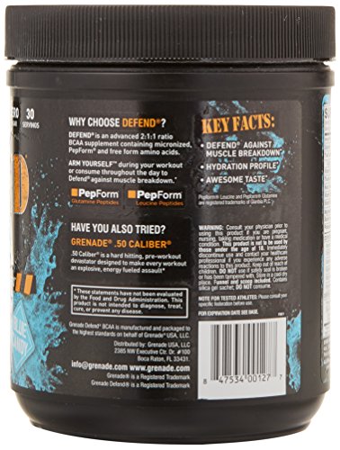 ReleaseDate : 2016-09-14 Studio : Grenade USA, LLC Publisher : Grenade USA, LLC Binding : Health and Beauty Product Description If you're lifting heavy and often and you want your muscles to grow to their maximum potential, you need to protect them from catabolic forces whenever possible. That means preventing muscle breakdown. The most basic, unavoidable reality when it comes to muscle growth is that you must ensure that more amino acids are entering the muscle tissue throughout the day than are leaving it. To achieve this delicate but crucial balance, you've got to be regularly making the most important amino acids available to your muscles. . PROVEN MUSCLE BUILDER - Defend is an advanced 2:1:1 ratio BCAA supplement containing micronized, PepForm, free form amino acids, hydrating nutrients, electrolytes and ZERO sugar.. The country of origin is United States. 0