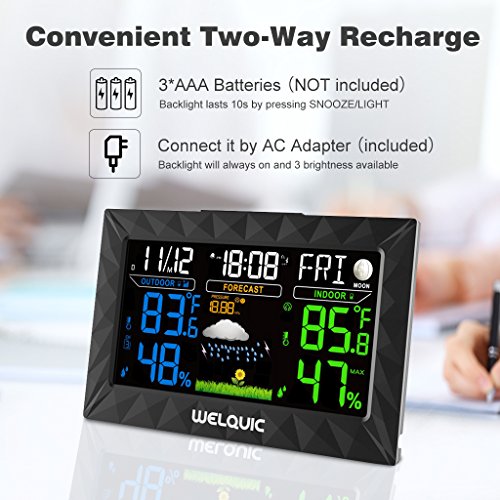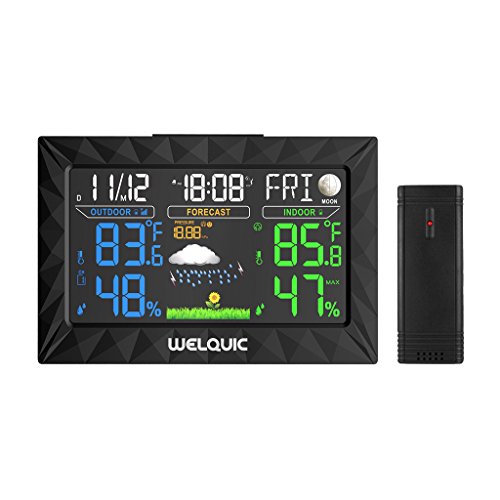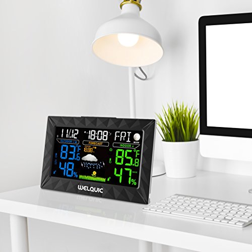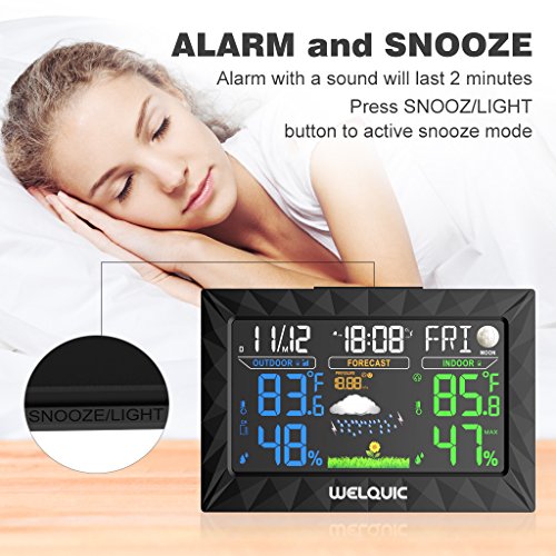 WELQUIC Digital Wireless Weather Station with Large LCD Color Display, Outdoor Sensor, Snooze Alarm, Barometer for Weather Forecast, Temperature Humidity Measure
