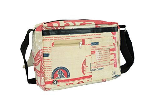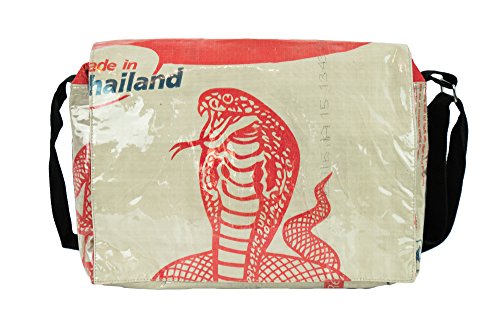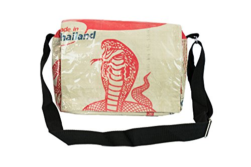 Messenger Bag, Cross Body Bag, Made from Recycled Cement Bags, Upcycled, Hand made in Cambodia, Cobra Design This is a really cool cross body messenger bag with a cobra design. Hand made from recycled cement bags, it is high quality, extremely durable and will last for many years. Due to the nature of the material, the bag is naturally water repellent. The main compartment has a zipper closure and there is another small zipper compartment on the outside and a few slots for cards or whatever. The flap stays closed with 2 magnetic snaps. This bag is big enough to hold up to a 13.3-inch laptop. Features: - Handmade in Cambodia from recycled cement bags