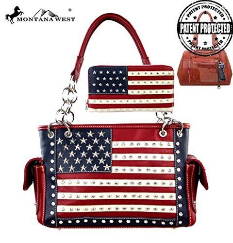 Product Description The American western purse is made of PU leather, american flag colors design on the front. Silver stars and crystal studs. A zipper enclosure on the top of the bag A single compartment divided by a medium zippered pocket A zippered pocket on the back to conceal the handgun (6.5 x 4.5). A zippered pocket on the inside back and 2 open pockets on the inside front. An open on the back. Metal feet on the bottom for protection and stability. Double flat straps. The handbag size is 12 x 4.5 x 10 inches (drop length 10.5 inches). The wallet is made of PU leather, this wallet has: American flag design on the front. Silver stars and silver studs. A zipper enclosure for the entire wallet. Single compartment divided by a medium zippered pocket. Single removable strap to convert the wallet into a wristlet. Pockets on the inside for ID, credit cards, cash, and more. The wallet size is 7.5 x 0.5 x 4.5 inches. 0
