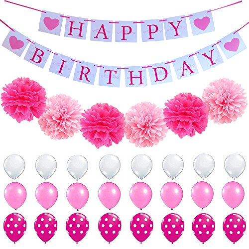 HAPPY BIRTHDAY PARTY DECORATION-Hot Pink Happy Birthday Banner Sign And Tissue Paper Flower Pom Pom, hot pink polka dots balloons,Perfect for 1st,16th,18th,21st,25th,30th Year old birthday.