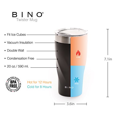 Studio : BINO Publisher : BINO Binding : Misc. Product Description BINO's 20 ounce Double Walled Vacuum Insulated Stainless Steel Mug keeps liquids cold for 8 hours and hot for 6 hours. Our Mug is 100% BPA-Free and made from all non-toxic materials. Our mug is condensation free, fits ice cubes and features a conveniant spill-proof screw top lid that makes it easy to take a drink on the go! 0