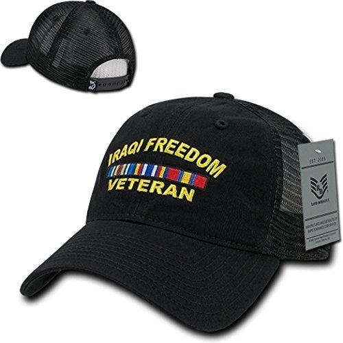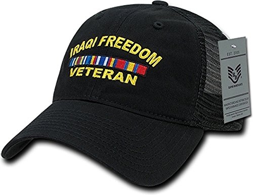 Product DescriptionRapDom Iraq Freedom Veteran Relaxed Trucker Mens Cap Adjustable - Black. Iraq Freedom Vet With Ribbons0