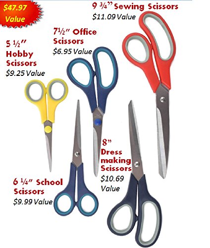 No matter what you want to cut, you'll find a pair of scissors in this set to get the job done. Includes: 5-1/2" hobby scissors, 7-1/2" office scissors, 6-1/4" school scissors, 8" dress making scissors and 9-3/4" sewing scissor