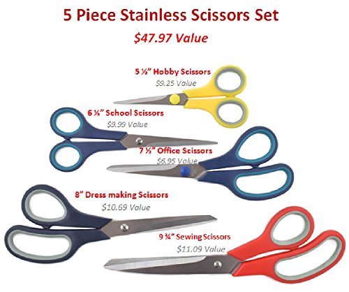 5 Piece Stainless Multi-Purpose Scissors Set - Inc. Office Scissor, School Scissor, Hobby Scissor, Dress Making Scissor, Sewing Scissor - Backed with a Lifetime Warranty