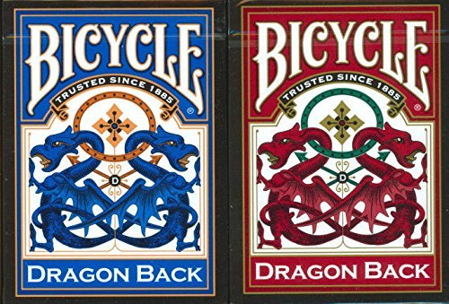 -. Binding : Misc. -. Brand : Bicycle -. EAN : 0073854020821 -. Feature : TWO DECKS OF DRAGON BACK DESIGN BICYCLE PLAYING CARDS / ONE RED DECK & ONE BLUE DECK 2 PACK / STANDARD POKER SIZE DECKS WITH AIR CUSHIONED FINISH / MADE IN USA -. Label : US Playing Card Co -. Manufacturer : US Playing Card Co -. PackageQuantity : 1 -. ProductGroup : Sports -. ProductTypeName : SPORTING_GOODS -. Publisher : US Playing Card Co -. Studio : US Playing Card Co -. Title : 2 Pack Bicycle Dragon Back Decks Red & Blue Standard Poker Playing Cards -. UPC : 073854020821