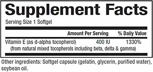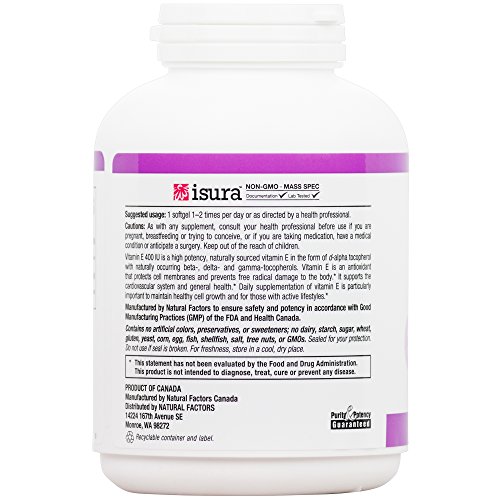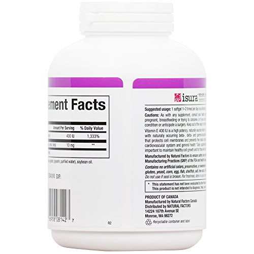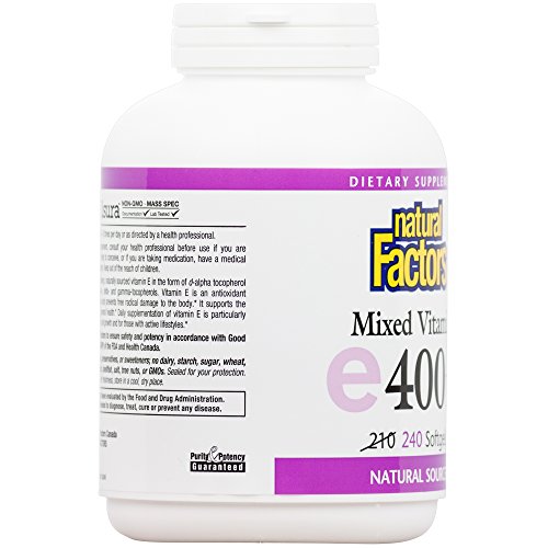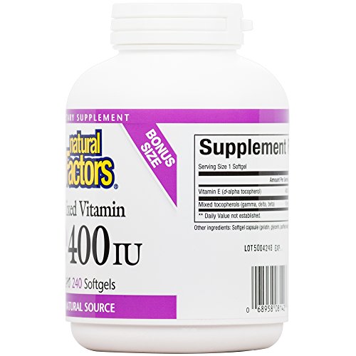Studio : Natural Factors Publisher : Natural Factors Binding : Health and Beauty Product Description Each easy-to-swallow soft gel contains 400 IU (International Units) of pure vitamin E in the form of d-alpha tocopherol, derived and isolated from 100% natural sources with additional beta, delta, and gamma tocopherols in a balanced ratio. Vitamin E is a fat-soluble vitamin and antioxidant that protects cell membranes and prevents free radical damage, supporting the cardiovascular system and general health. Vitamin E?s ability to protect cell membranes is important for people in polluted environments and those with active lifestyles. Experts recommend daily supplementation of vitamin E as it is difficult to get enough through diet alone. 0