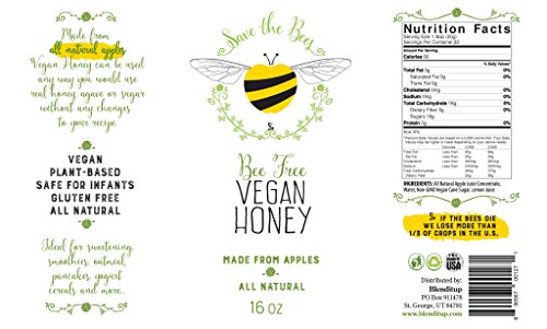 -. Binding : Misc. -. Brand : BlendItUp -. EAN : 0890567001073 -. Feature : VEGAN HONEY: This bee free honey is made from all natural apple and completely vegan. / PLANT-BASED: There is no bee formulated honey mixed with this vegan bee free honey. / GLUTEN FREE: This honey is completely gluten free to keep you healthy. / SAFE FOR INFANTS: The ingredients of the bee free apple made honey is all naturals. It's 100% safe for baby. / SAVE THE BEE: Use vegan honey and contribute to saving the bee. -. IsAdultProduct : 0 -. Label : Blenditup -. Manufacturer : Blenditup -. PackageQuantity : 1 -. ProductGroup : Grocery -. ProductTypeName : GROCERY -. Publisher : Blenditup -. Studio : Blenditup -. Title : Blenditup Bee Free Vegan Honey (16 Oz) - Plant Based & All Natural Apple Made Honey - Ideal for Sweeten Your Foods of Your Choice -. UPC : 890567001073