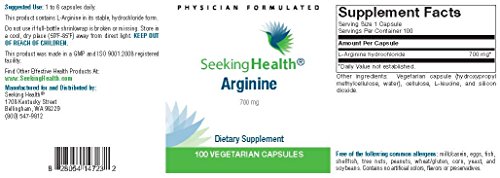 -. Binding : Health and Beauty -. IsAdultProduct : 0 -. Label : Seeking Health -. LegalDisclaimer : *These statements have not been evaluated by the Food and Drug Administration. This product is not intended to diagnose, treat, cure, or prevent any disease. -. Manufacturer : Seeking Health -. PackageQuantity : 1 -. ProductGroup : Health and Beauty -. ProductTypeName : HEALTH_PERSONAL_CARE -. Publisher : Seeking Health -. Studio : Seeking Health -. Title : Arginine | Provides 700 mg of L-Arginine | 100 Easy-To-Swallow Vegetarian Capsules | Non-GMO | Free of Magnesium Stearate | Free of Allergens | Physcian Formulated | Seeking Health
