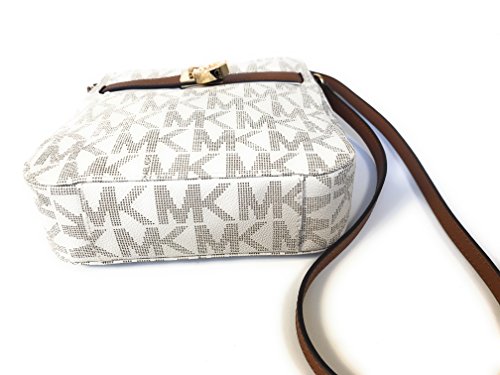 -. Brand : -. Feature : Signature PVC in Vanilla and Saffiano leather trim in lage / Zip top closure / Gold tone hardware / MK gold logo engraved padlock accent on front / Adjustable leather strap with 20.5" - 24" drop / Signature PVC en vainilla y ribete en piel de Saffiano en equipaje / cierre superior cierre / Hardware de tono oro / MK Gold logo engraved candado acento en la parte delantera / Correa de piel ajustable con 20.5" - 24" Drop -. ProductGroup : Shoes -. ProductTypeName : HANDBAG -. Title : Signature PVC Hamilton Traveler Crossbody Bag Vanilla/Lage