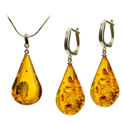 -. Title : 14k Gold Light Amber Drop Pendant And Earrings Set Box Gold Chain 18 Inches