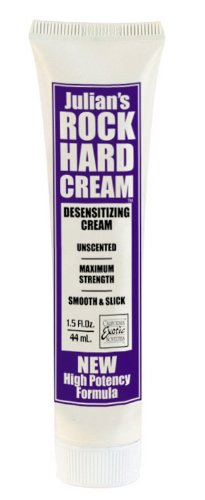 Studio : California Exotic Novelties Publisher : California Exotic Novelties Binding : Health and Beauty Product Description Julian's Rock Hard Cream is a desensitizing cream for long lasting erections. Contains 7.5% Benzocaine which acts as a desensitizing agent to help the man maintain and prolong his erection and help delay or prevent premature ejaculation. Odorless and tasteless. This product can also be more helpful when used along with a cock ring. 1.5 fluid ounces or 44ml e. Julian's Rock Hard Cream is a registered trademark for California Exotic Novelties. Made in the USA. Sex toys and sexual wellness. New images for 2013. 0