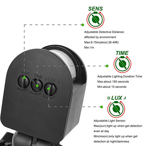 Adjustable sensitivity & on-time/Duration of Light as Yours Preference: The motion sensor has sensitivity and on-time adjustable knobs for precision control and provides 180°motion-activated sensor detects movement with up to 32 ft. range and 6-480 seconds downward perimeter protection, automatically turning the light on at working mode. It provides a high brightness lighting environment