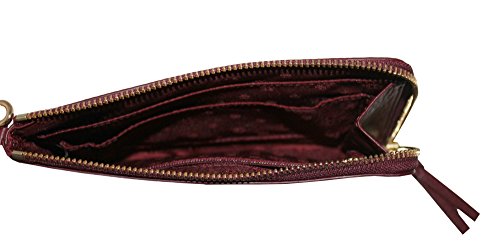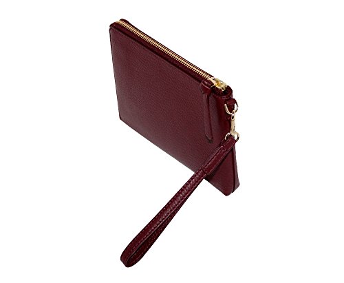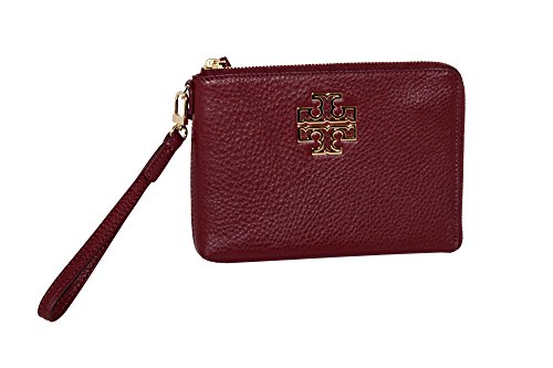 Product Description Soft pebbled leather with polished golden tone hardware and stacked T logo on front Custom logo print lined interior with inner zippered pocket and open slip pocket Inner slot that will fit smaller smart phones, or place larger phones in center Zippered L closure and removable wristlet strap with 5.5 inch drop Measures approximately 7 inches (L) x 5 inches (W) 0