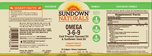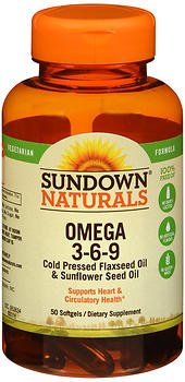 Sundown Naturals Vegetarian Omega 3-6-9 provides you with one of the best sources of vegetarian Omega-3 - flaxseed oil, in a vegetarian softgel. Just one softgel a day supplies an excellent source of Omega-3 and also delivers lower doses of Omega-6 and 9, from flaxseed and sunflower seed oil. Vegetarian Omega 3-6-9 supports heart health and healthy circulation, and contains 495 mg of Omega-3s.*Feature