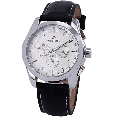 -. Title : GuTe出品 自動巻き 腕時計 メンズ 革バンド カレンダー 日付 シンプル 目盛り 機械式 シルバー ホワイト