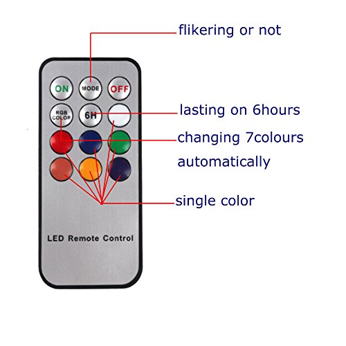 - How to use: there are 7 color keys to your choose: white, blue, red, green, orange, yellow, dark blue. "Multi color" mean the candle will be changed to seven colors at random."Mode" means it will be fickering or not flickering.