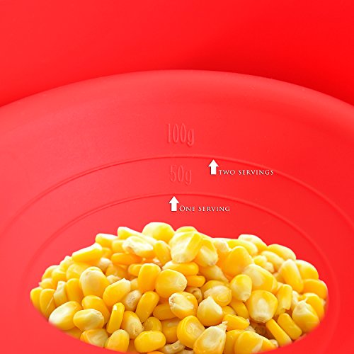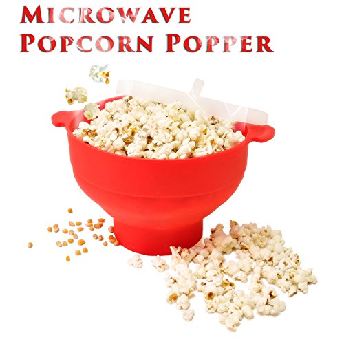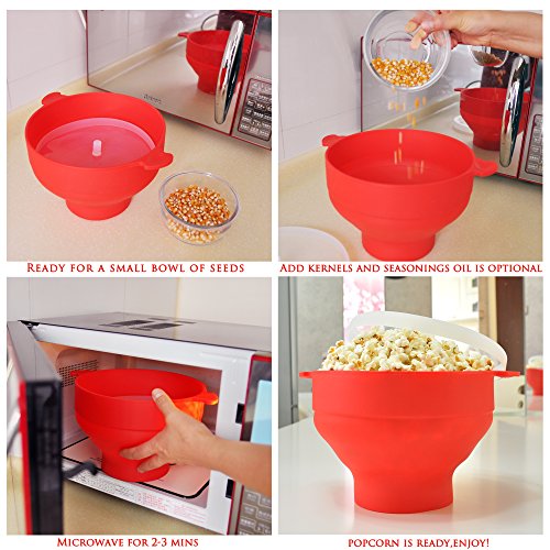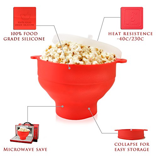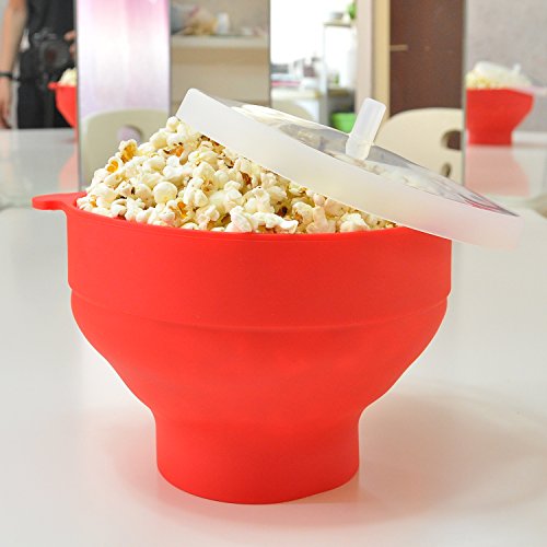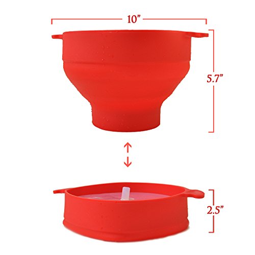 Microwave Popcorn Popper Sturdy Convenient Handles Healthy No Oil Silicone Red Collapsible Hot Air Movie Theater Aroma Great Popcorn Maker Machine.BPA PVC Free With Lid (Red)