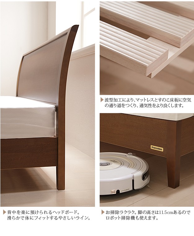 【床板すのこ仕様ベッド】床板部分がすのこなので通気性が抜群です。脚付なのでお掃除に便利。お掃除ロボットも使用できます。