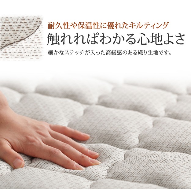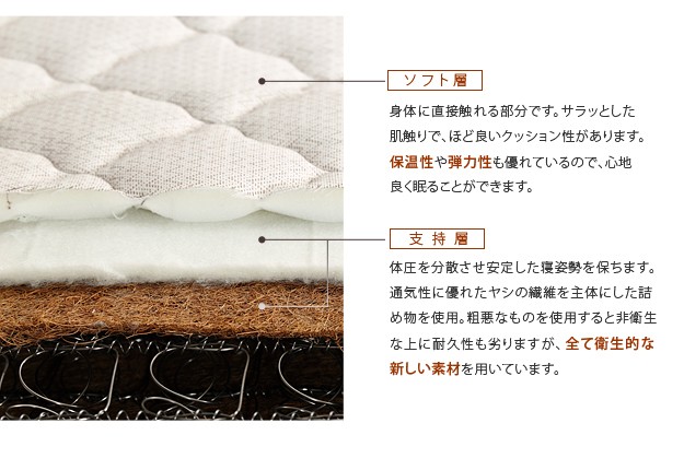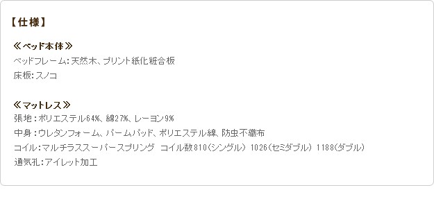 材質:[ベッド]本体-天然木・プリント紙化粧合板、床板-スノコ床板、[マットレス]張地-ポリエステル64%・綿27%・レーヨン9%、中身-ウレタンフォーム・パームパッド・ポリエステル綿・防虫不織布、コイル-マルチラススーパースプリング・コイル数1026、通気孔-アイレット加工