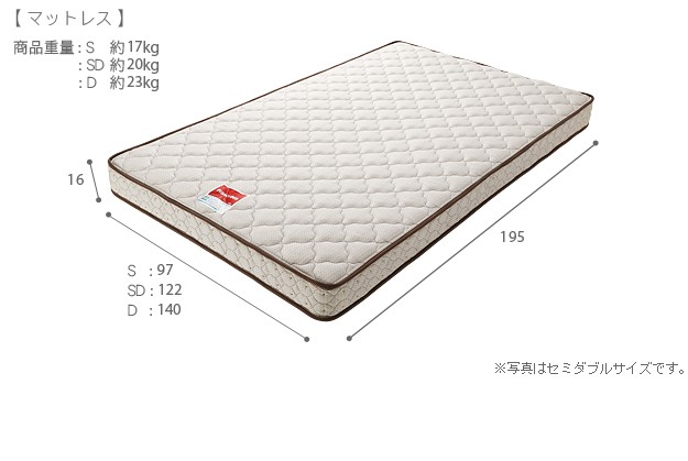 サイズ(cm):[ベッド]幅123x奥行206x高さ82(床板高さ26)cm・約38kg、[マットレス]幅122x奥行195x高さ16cm・約20kg