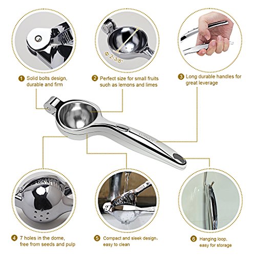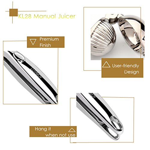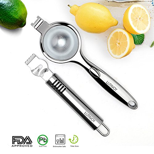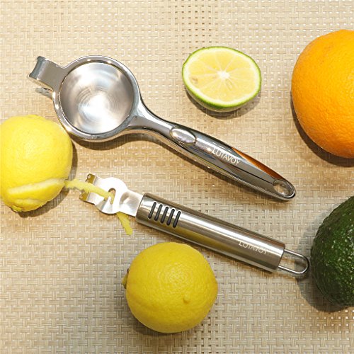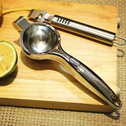 Kitchen Essential Prepare Gadgets LUTAVOY KL28 Citrus Squeezer Zester Set works great for removing the zest and extracting juice. The 2 handheld tools are perfect inventions for cocktails, breakfast drinks, and more. Refreshing Everyday ! Drinking freshly squeezed juice, you can absorb up to 80% more of the nutrients. LUTAVOY KL28 Handy Juicer Combo works with citrus fruits,such as oranges, grapefruits, lemons, limes, citrons and tangerines. Endless Creative Possibilities... Need a gift idea? This LUTAVOY KL28 Lemon Squeezer Zester Juice Combo Set make a great gift for Wedding party, Mother's Day, Valentine's Day,Thanksgiving,Christmas, Easter, Birthdays, or any occasion. Specification: Brand: LUTAVOY Model: KL28 Material: Citrus Jucier: Zinc Alloy(Chrome Finish) Fruit Zester: Stainless Steel (Brushed Finish) Dishwasher Safe:YES Dimension: Citrus Squeezer: 8inch Long Fruit Zester: 6inch Long Package Include: 1* Handheld Jucier 1* Fruit Zester 1* Product Manual 0