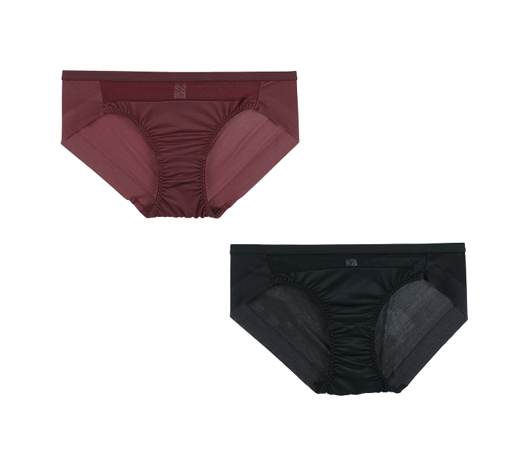 고급스러운 버건디, 블랙 두 컬러로 구성된 노와이어 브라 제품의 세트 팬티.