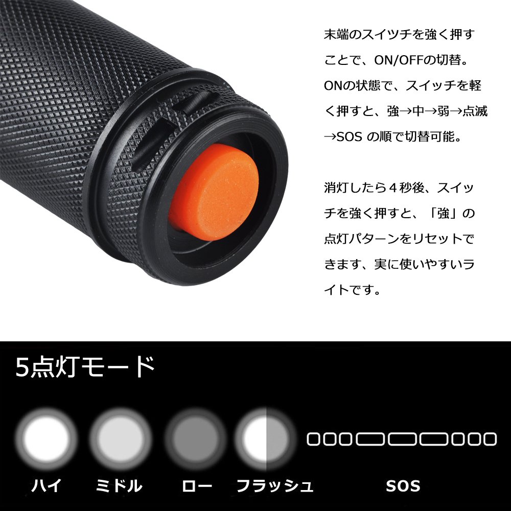 5 Lighting mode: High / Middle / Low / Flash / SOS