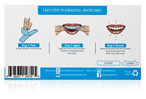 Whitening That Works Have you been searching for a simple teeth whitening system that actually brightens your smile? Sick of that nasty acidic taste when you apply your strips? Want to stay away from gels that can damage your enamel? Want to ensure that each strip fits right the first time so it whitens your teeth and not anything else? BrightWhite Smile teeth whitening strips are specifically designed to be easy to use, safe for your enamel, and a perfect fit for your mouth. Fourteen Treatments: Each package contains 28 strips, or 14 treatments for your entire mouth. Five Times Brighter: This system is capable of brightening your smile by a factor of five with just two weeks of treatments of 30 minutes each. Comfort Fit: We've designed these strips to securely and comfortably fit over your teeth and deliver the whitening power where you need it most. Enamel Safe: No matter the sensitivity of your teeth to traditional whitening products, you'll be able to use BrightWhite Smile to its best advantage with a minimum of discomfort. Easily Apply: