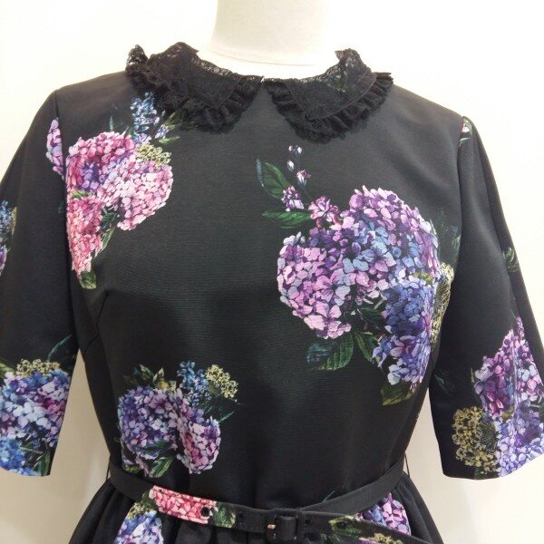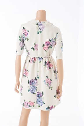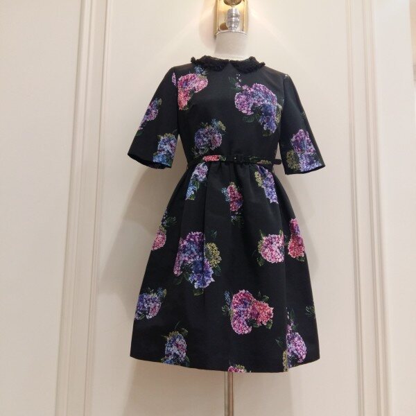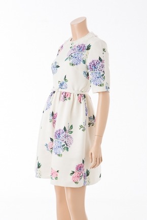 수국 프린트의 여성스러운 원피스입니다. 탈부착 가능한 도트 망사 레이스 칼라로 포인트를 주었습니다. 허리선의 턱셔링으로 풍성한 스커트라인이 돋보이는 아이템입니다.