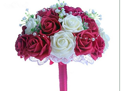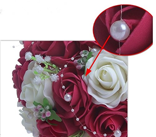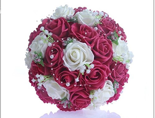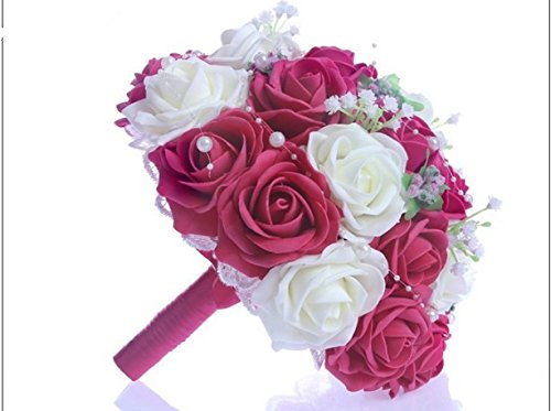 Hestian 10" Hot Pink and White Roses with Pearls Chain Bridal Wedding Bouquet Silk Rose Hand Tie (30pcs Roses)