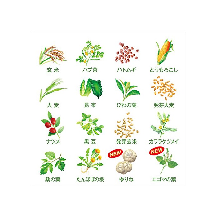 원재료:비둘기《무기》,보리,허브다,발아 보리,옥수수,현미,비와의 엽,검은 콩(대두)고, 발아 현미,다시마,표고버섯,아마츄어《차즈루》,구아바엽,뽕나무의잎,만나(맞)고, 기미,비타민C