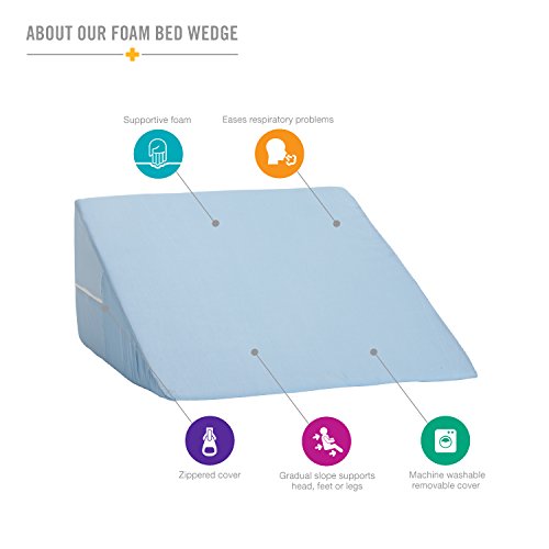 This best-selling slanted foam bed wedge is ideal for head, foot or leg elevation. Use it at the head of the bed to help relieve the symptoms of acid reflux, respiratory problems or neck and shoulder pain. Or at the foot of the bed to help relieve knee, leg or back pain. Or just prop yourself up in bed while reading, watching TV or working on your tablet. It comes with a removable blue zippered cover that’s machine washable.