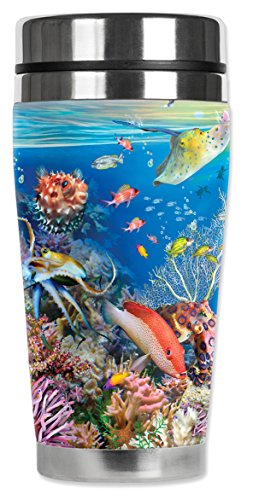 Mugzie 742-MAX "Wonders of the Sea" Stainless Steel Travel Mug with Insulated Wetsuit Cover, 20 oz, Black