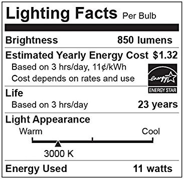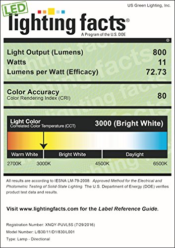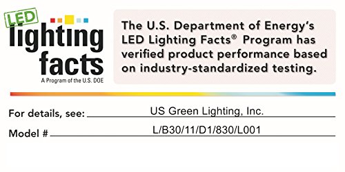 Studio : US Green Lighting Publisher : US Green Lighting Product Description Product Details ? 11 Watts ? 65W equivalent ? Life: 25,000 hours ? Dimmable ? E26 Base ? 850 Lumens ? CRI 80 ? Beam Angle: 110° ? Input Voltage: 120V ? Suitable for Damp Locations ? Minimum Operating Temperature: -20° C Safe and Environmentally Friendly ? No harmful UV Radiation. ? No Lead or Mercury. ? Certificate: Energy Star, UL Listed ? 5 Year Warranty Dimmer Compatibility List LUTRON DIMMER: S-600PR-WH DVCL-153PR-WH SLV-600P-WH DVCL-153P-GR DVSCCL-153P-SW DVWCL-153PH-WH LEVITON DIMMER: R70-06631-1LW R62-06674-POW R12-06672 GE DIMMER: 18023 COOPER DIMMER: SAL06P-W-K 0