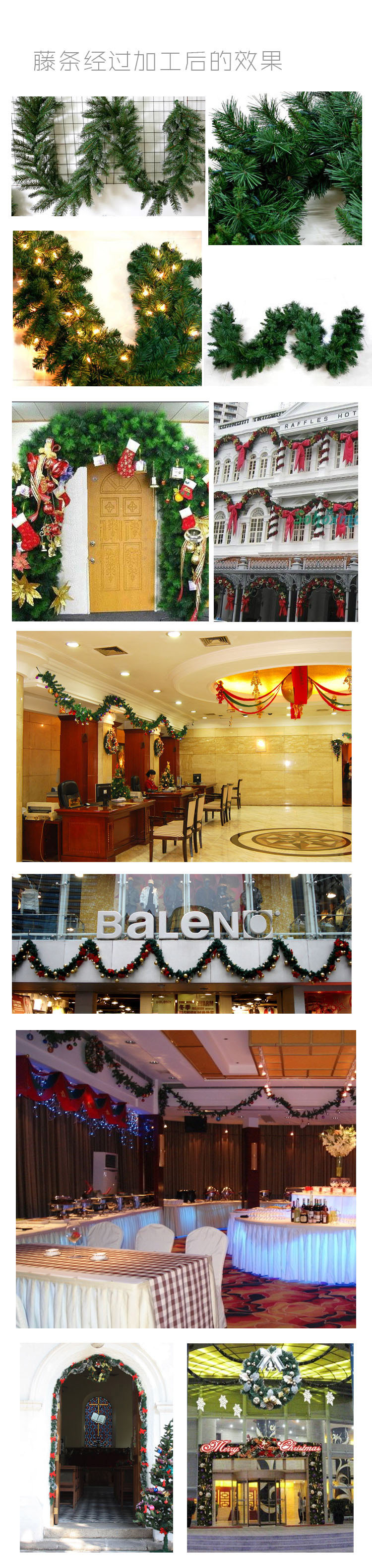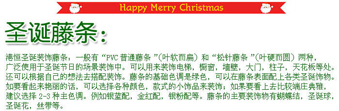 [Name]Christmas decorations Christmas 270 * 25cm PVC rattan encryption 200 branches (without decoration)[Weight] 0.80kg (kg)[Material] PVC[Size] 270 * 25cm[Color] green