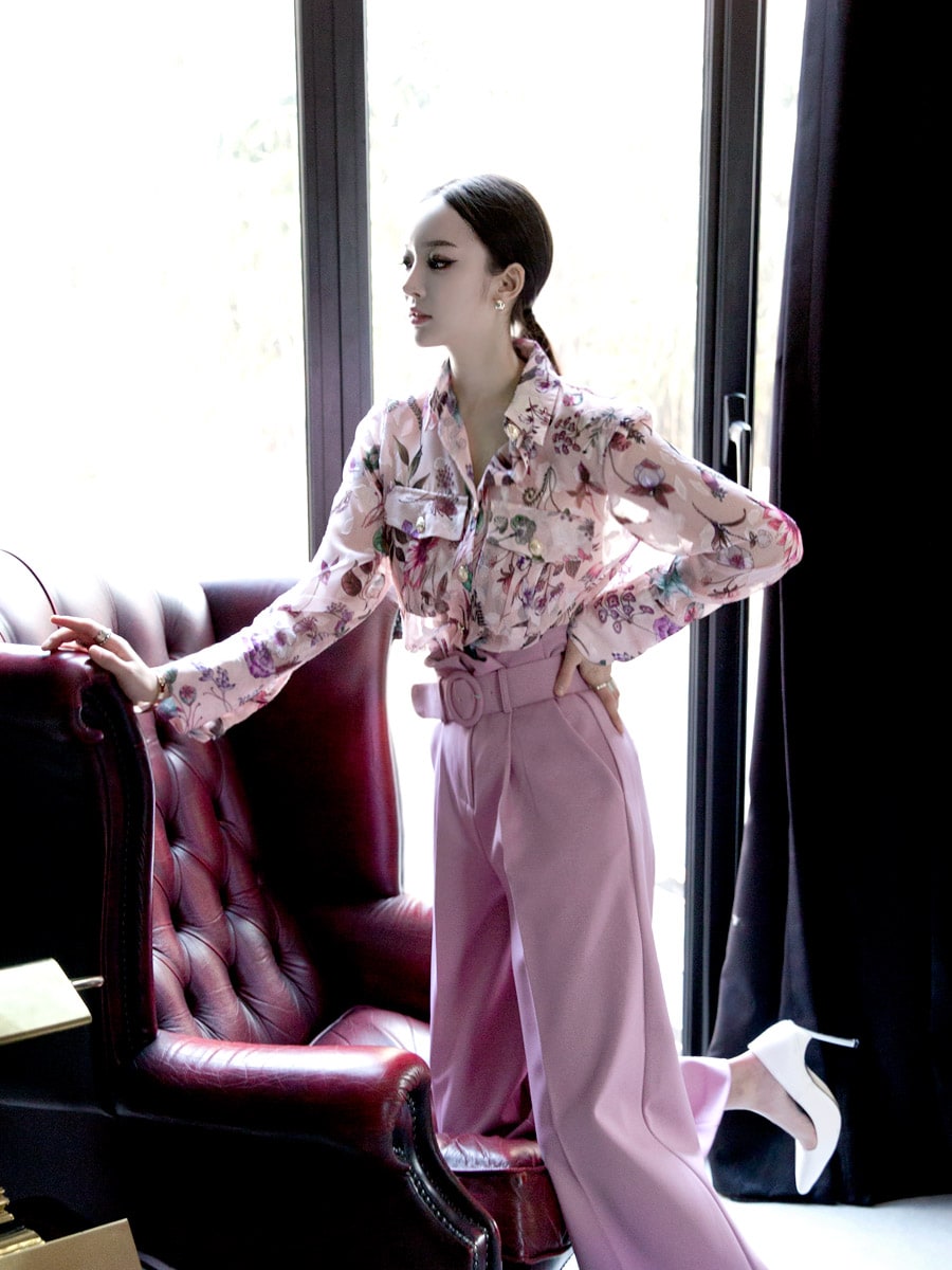B2156 골드버튼 플라워 나염 블라우스 Pink mix