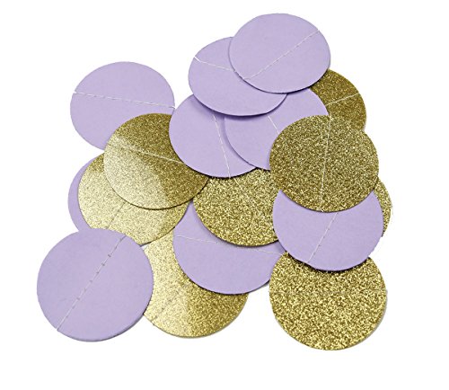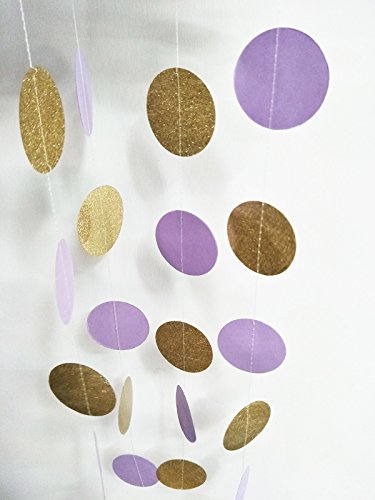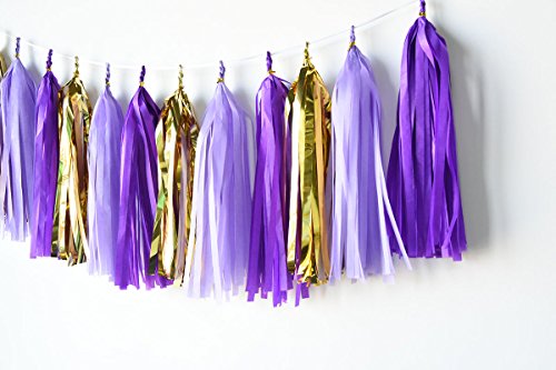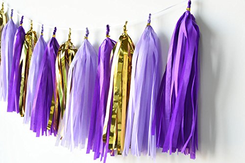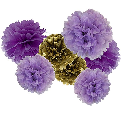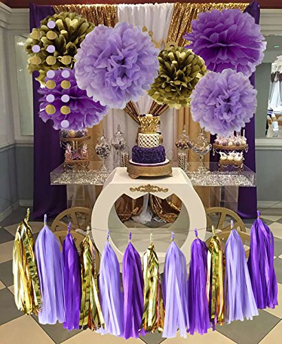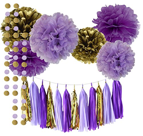 - Tissue Paper Flower Purple Party/bridal shower favors packe List: 6 pcs tissue paper flowers:2 pcs lavender(1*12inch+1*10inch)+2 pcs purple(1*12inch+1*10inch)+2 pcs gold Tissue Paper Pom Poms(1* 12inch+1*10inch); 1 pack of baby purple lavender gold mixed color tissue paper tassel with one white ribbon and using instruction,totally 12 sheets,each color comes with 4 pcs.2pcs lavender mixed gold circle dot paper garland . Length: approximately 6.5 feet.
