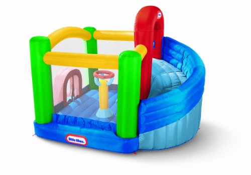 -. Feature : Includes a hoop and ball for sports fun, a rock-climbing wall for energetic play / Large padded jumping area for fast action / Stakes anchor the bouncer firmly in place, while a heavy-duty blower provides continuous air flow / Built of puncture-resistant material with durable mesh netting / Includes ball, stakes, heavy duty blower with GFCI, repair kit and storage bag
