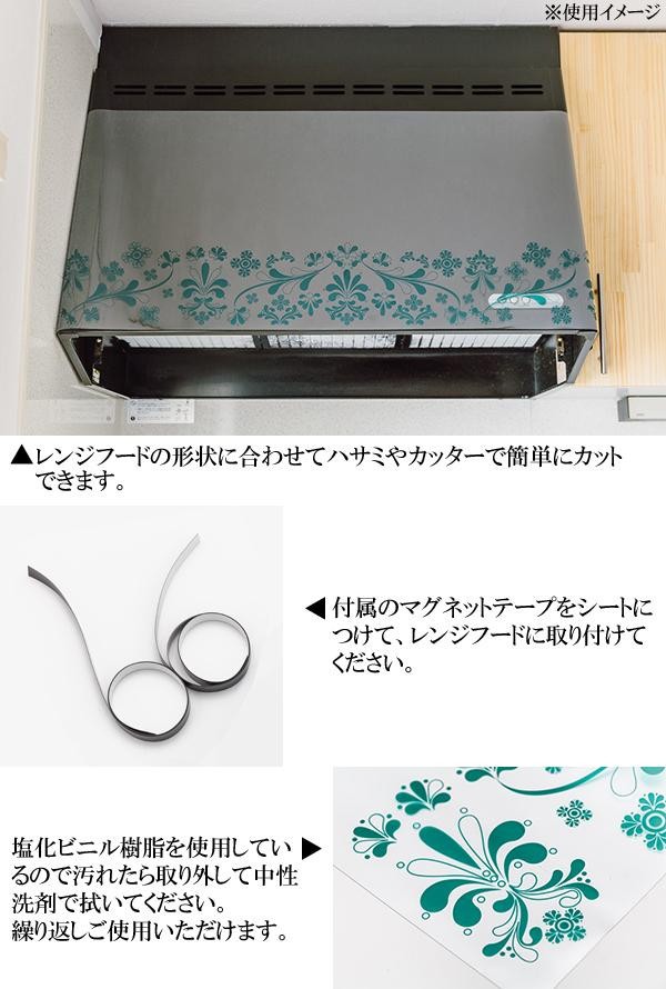 | 付属のマグネットテープで、シートをレンジフードに貼るだけ!!マグネットなので何度も貼り直しができ、剥した後も糊残りがありません。塩化ビニル樹脂を使用しているので、油やホコリも染みず、取り外して拭けるのでお掃除もラクラクです。レンジフードの形状に合わせてハサミやカッターで簡単にカットすることができます。 |