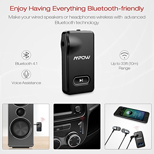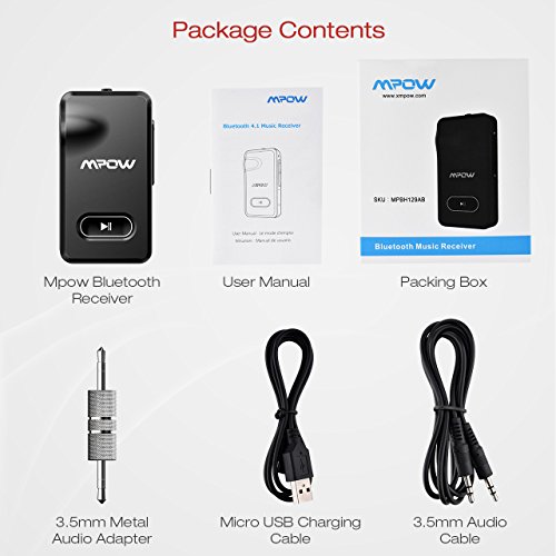 Wirelessly Transmit Music Anywhere Anytime: Bluetooth 4.1 delivers clear, distortion-free digital audio to wired headphones, speakers up to 33 feet away. Enjoy crisp wireless tunes when you are on the road or at home, or simply when you want to keep the entertainment for yourself only. Talk in Clarity and Convenience: Built-in microphone and multi-point technology allows you to listen to your music and no more worry about missing any calls. Automatically Re-connection: When the Bluetooth function of a mobile phone is ON, Mpow will connect with the last mobile phone or computer automatically. Specifications: Bluetooth Version:V4.1 Frequency Range:2.4GHz Output Power Category: Class 2 Bluetooth Mode: HFP/HSP/A2DP/AVRCP Bluetooth Range: Up to 33 feet Power Supply: Li-Po 180mAh Bluetooth Receiver Operating Time: About 11 hours Charge Voltage: DC 5.0V Attention: 1. Please use 5V standard charger to charge Mpow Bluetooth receiver. Do not use quick charger/ flash charger/ fast charger with output voltage over 5V. 2. Mpow will auto-off if it is disconnected for 10 minutes to save energy. Package Included: Mpow Bluetooth Receiver ¡A 1 3.5mm Audio Cable¡A 1 3.5 mm Metal Audio Adapter¡A 1 Charging Cable¡A 1 User Manual¡A 1 0