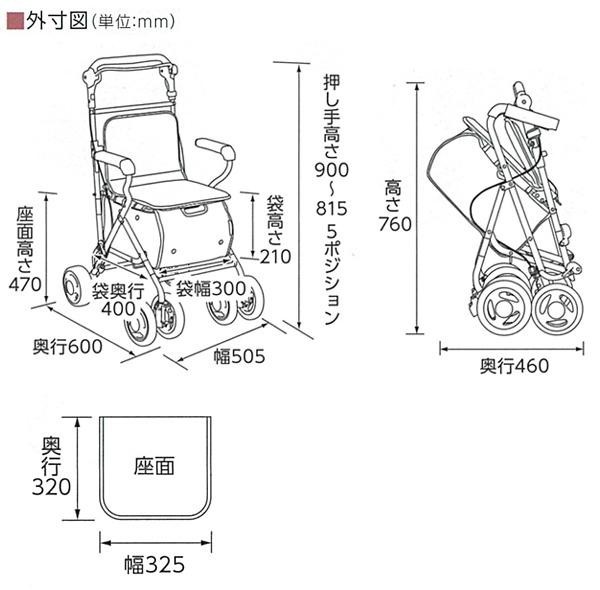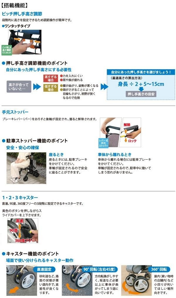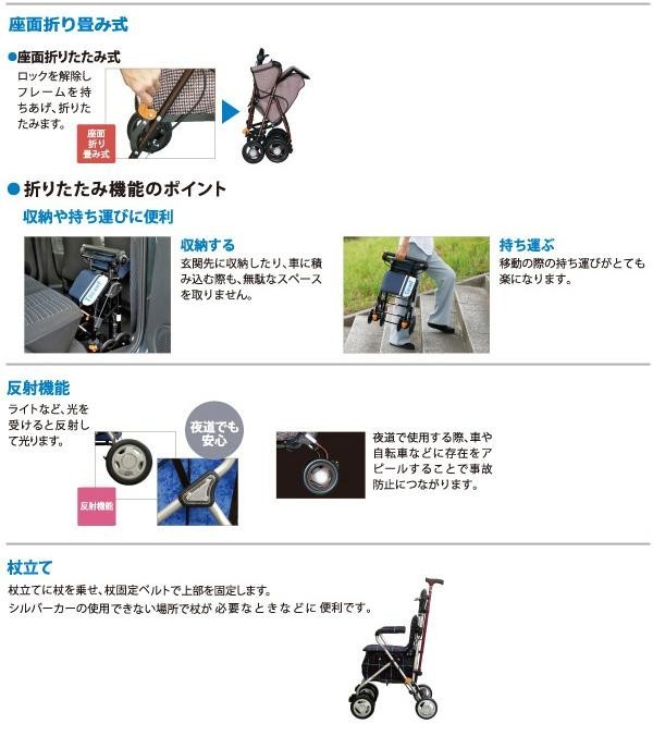 座面下の大容量収納、大きな前輪と幅広の後輪による安定性、長時間座っていても疲れにくい広々座面が特徴のスタンダードタイプのシルバーカーです。毎日のお買い物や、お出かけの時に最適です。 |