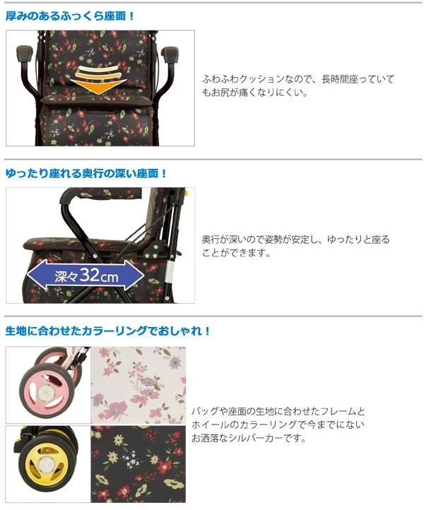| 座面下の大容量収納、大きな前輪と幅広の後輪による安定性、長時間座っていても疲れにくい広々座面が特徴のスタンダードタイプのシルバーカーです。毎日のお買い物や、お出かけの時に最適です。 |